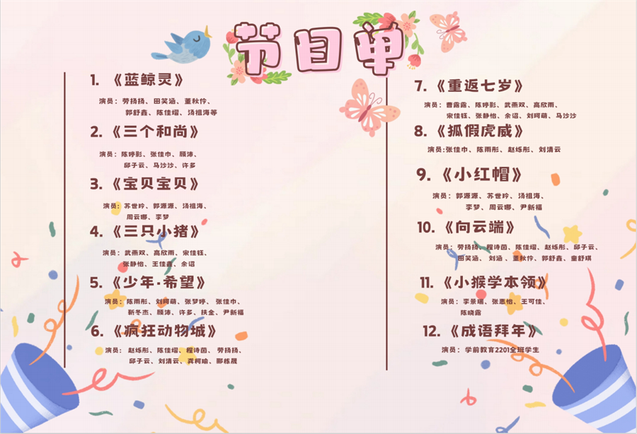 此次儿童文学与创作结课汇报展演将理论知识与实践相结合,在任课老师王雨晴老师、陈美霖老师的带领下,学前教育2022级全体同学综合运用美术、音乐、舞蹈、儿童剧目编排等能力从展演策划、节目编排、现场布置等方面积极参与,共同完成,其中儿童剧均由学生根据原有剧本改编完成,整场结课汇报展积极体现学前教育专业人才培养方案中的海洋文化特色。