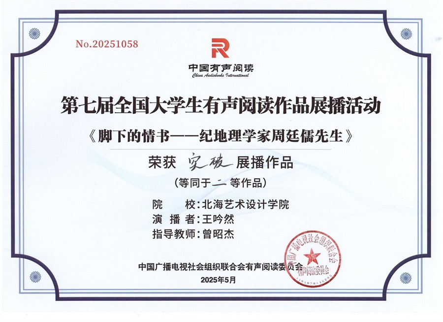 近日,第七届全国大学生有声阅读作品展播活动于天津传媒学院圆满闭幕。我校动画与传媒学院2023级播音与主持艺术专业学生王吟然作品《脚下的情书——纪地理学家周廷儒先生》斩获突破展播作品奖,教师曾昭杰获优秀指导教师奖。同时,学校连续三年获优秀组织单位奖。