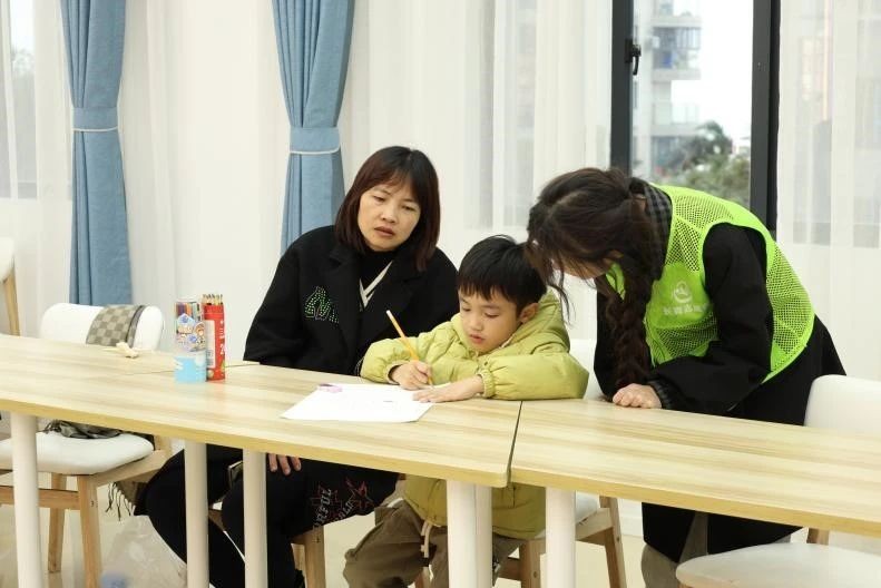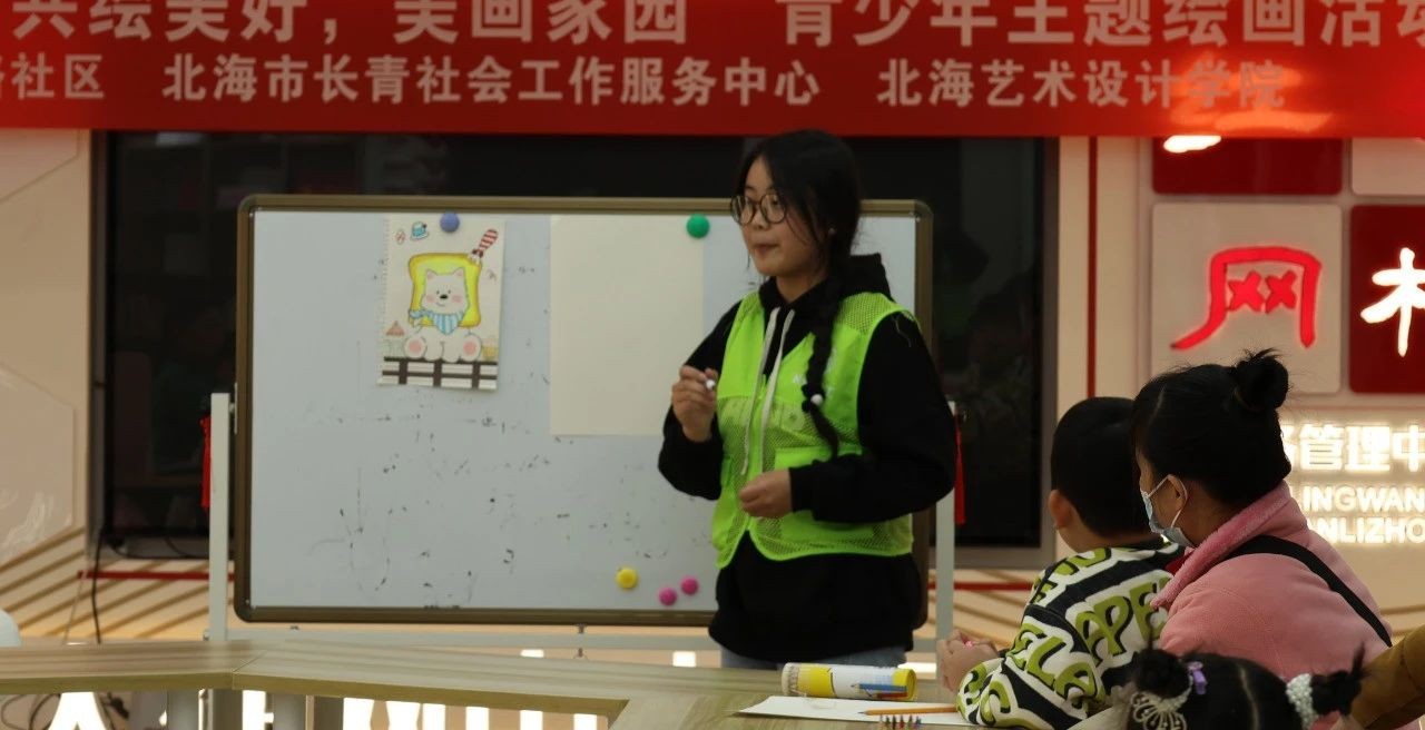 青年志愿者们通过生动的示范和亲切的指导鼓励孩子们自由创作,画出小脑袋里的天马行空。画笔在纸上跳跃,孩子们用色彩表达情感,一幅幅可爱的画作诞生在充满温暖的社区里。